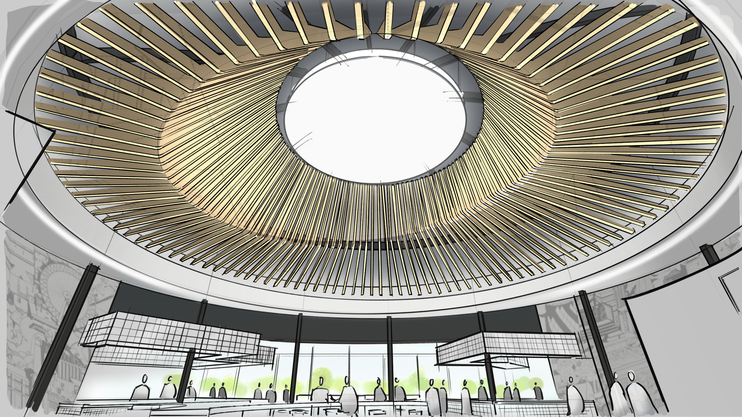 The Joan Benoit Samuelson Rotunda at Nike WHQ celebrates the legendary runner's legacy through a design that embodies brightness, minimalism, speed, lightness, refinement, and efficiency. The space features a rhythmic array of slats that evoke a persistent tempo, reflecting her accomplishments and the spirit of running.